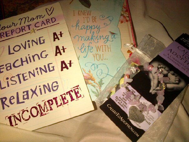 Well I sure have had a great mother's day so far! My day started with breakfast in bed, some super sweet cards, a beautiful orchid, a sweet adoption prayer bracelet from hubby, and an adorable clay bracelet made by my sweet Emmy. Of course I can't forget about my lovely standing mirror/jewelry cabinet either. I'm a lucky mommy...